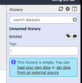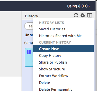 Work Histories are Galaxy’s way of enabling users to create multiple isolated workspaces. You can think of your current Work History as your current workspace. At any point in time, your History window displays all the data you have either downloaded or produced in your current workspace.